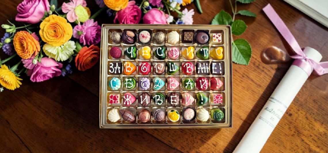Кутия с надпис с Вашето пожелание - с 48 бр шоколадови бонбони