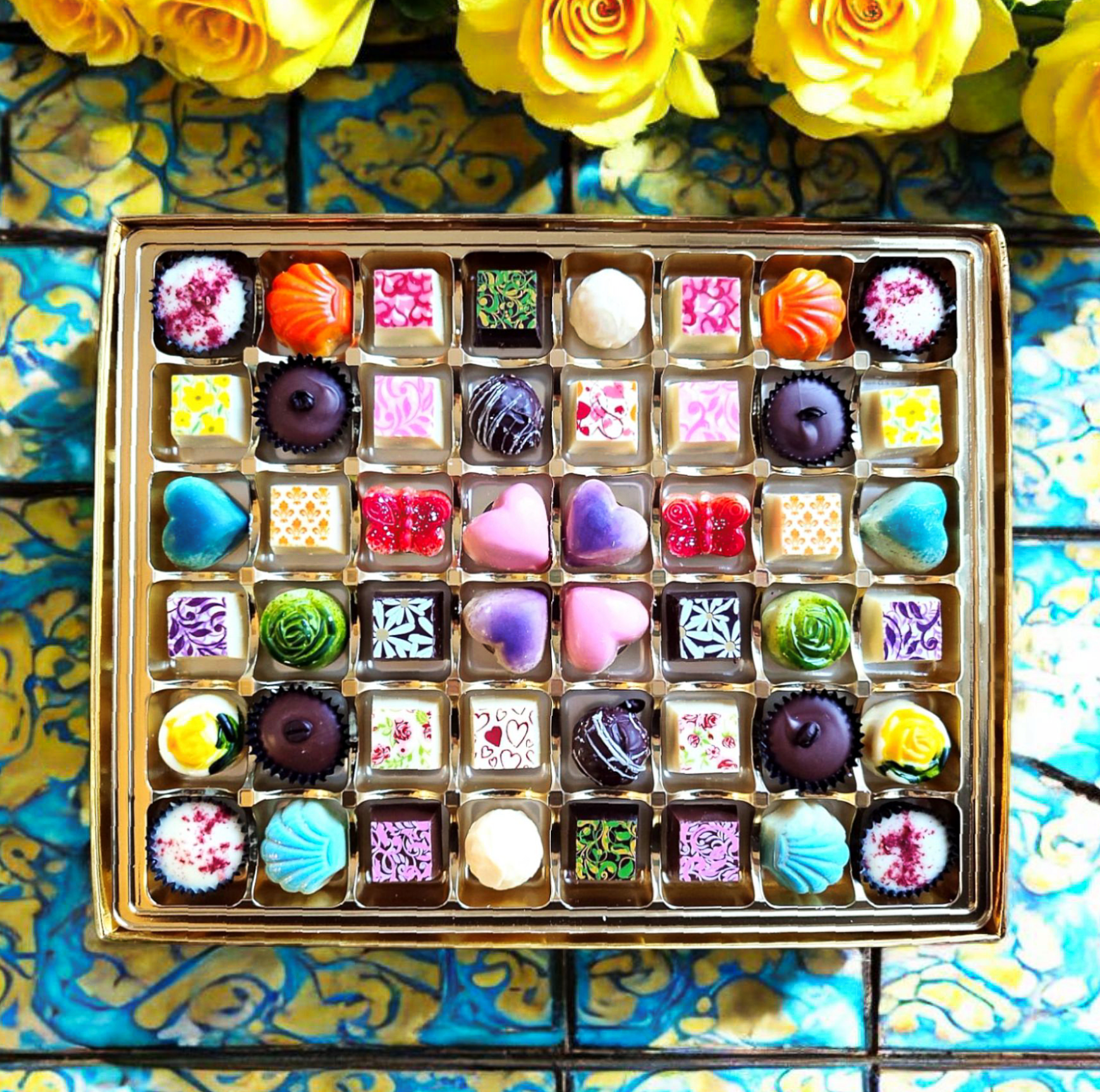 Ръчно изработени шоколадови бонбони, с много цвят и богатство от вкусове и дизайн, опаковани в луксозна подаръчна кутия. Оригинален подарък, изработен с любов и внимание към детайла.