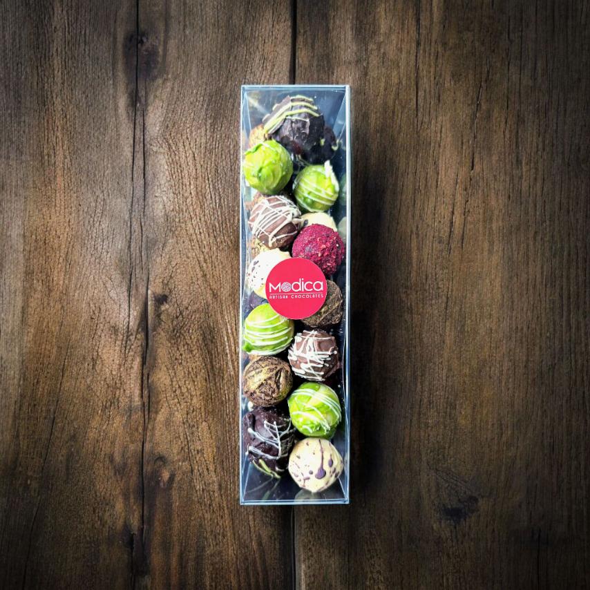Луксозна прозрачна кутия с 6 вида ръчни шоколадови трюфели.