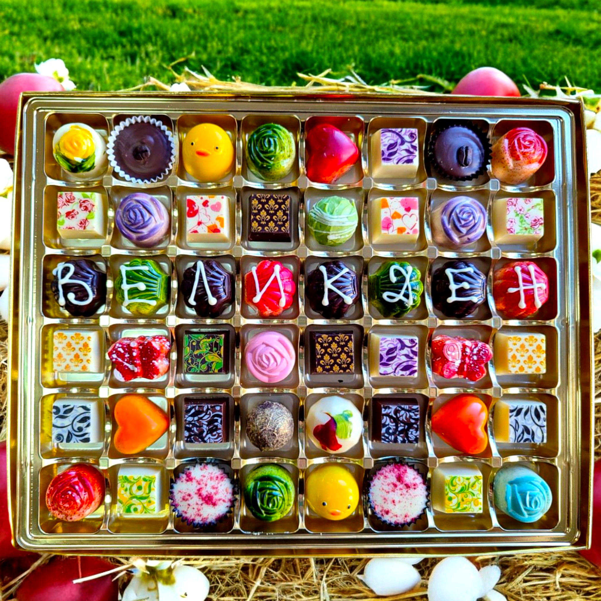 Красива кутия за Великден с 48 ръчно изработени шоколадови бонбони, с много цвят и богатство от вкусове и дизайн ,