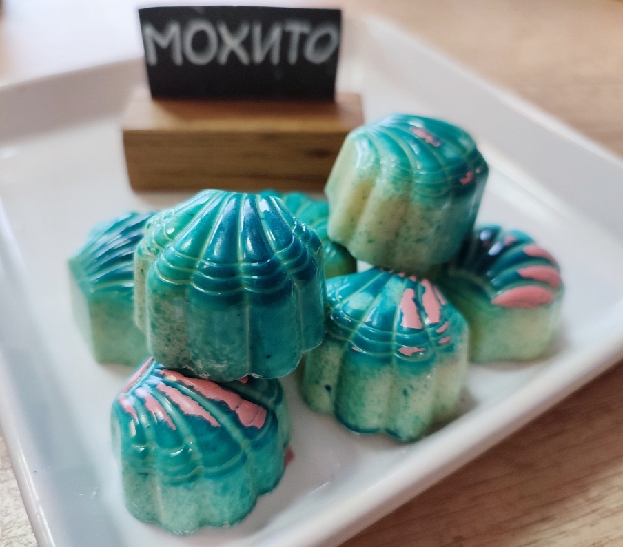 Черен пралин с ганаш Мохито Съдържа: какаова маса, какаово масло, емулгатор СОЕВ лецитин, Животинска сметана 36% , естествен алкохол - ром, етеричо масло от мента , натурален аромат ванилияЧерупка от бял шоколад в екзотично тюркоазено сино с ганаш Мохито ( бял шоколад, лайм, мента, кубински ром)