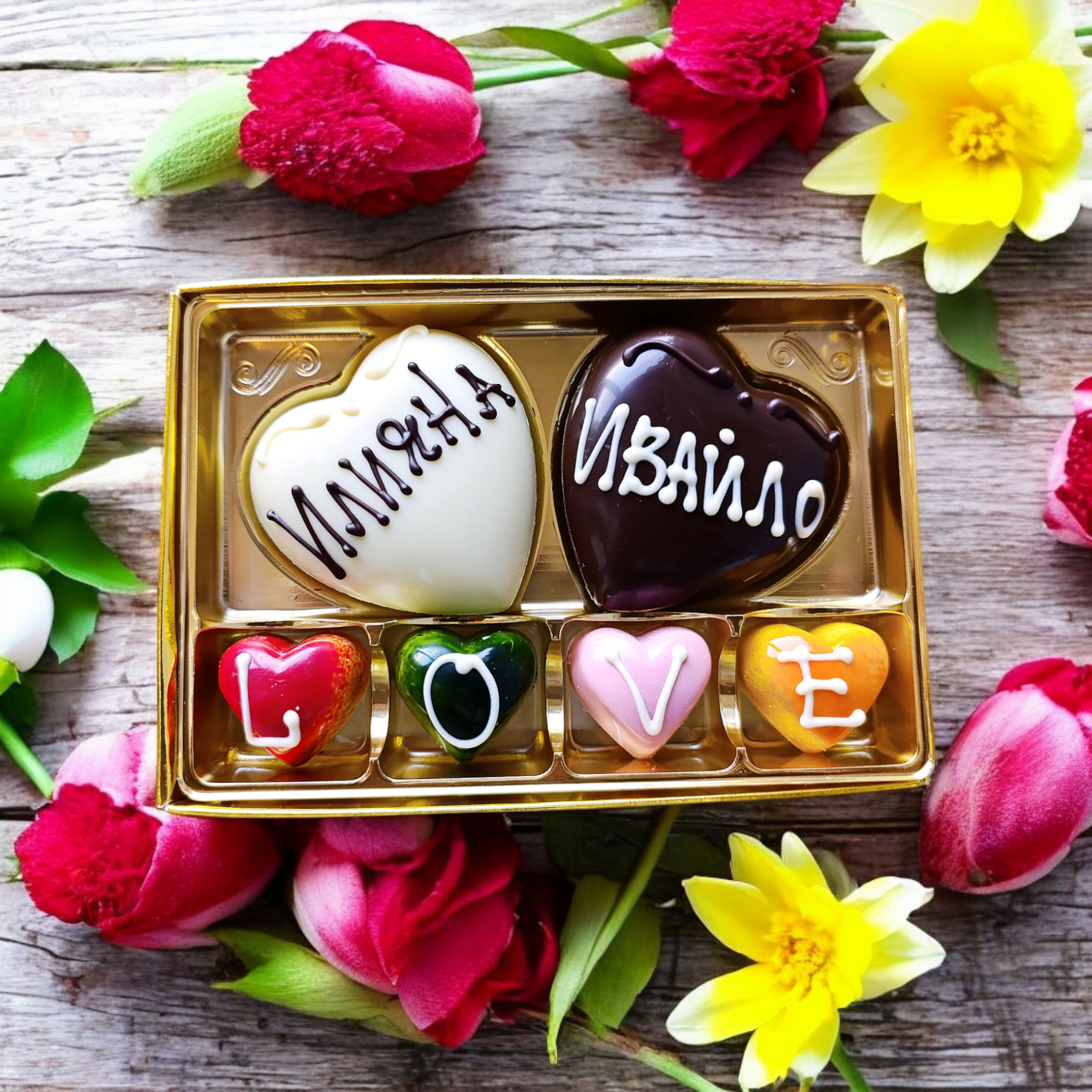 Шоколадови сърца с лични имена в кутия и Love