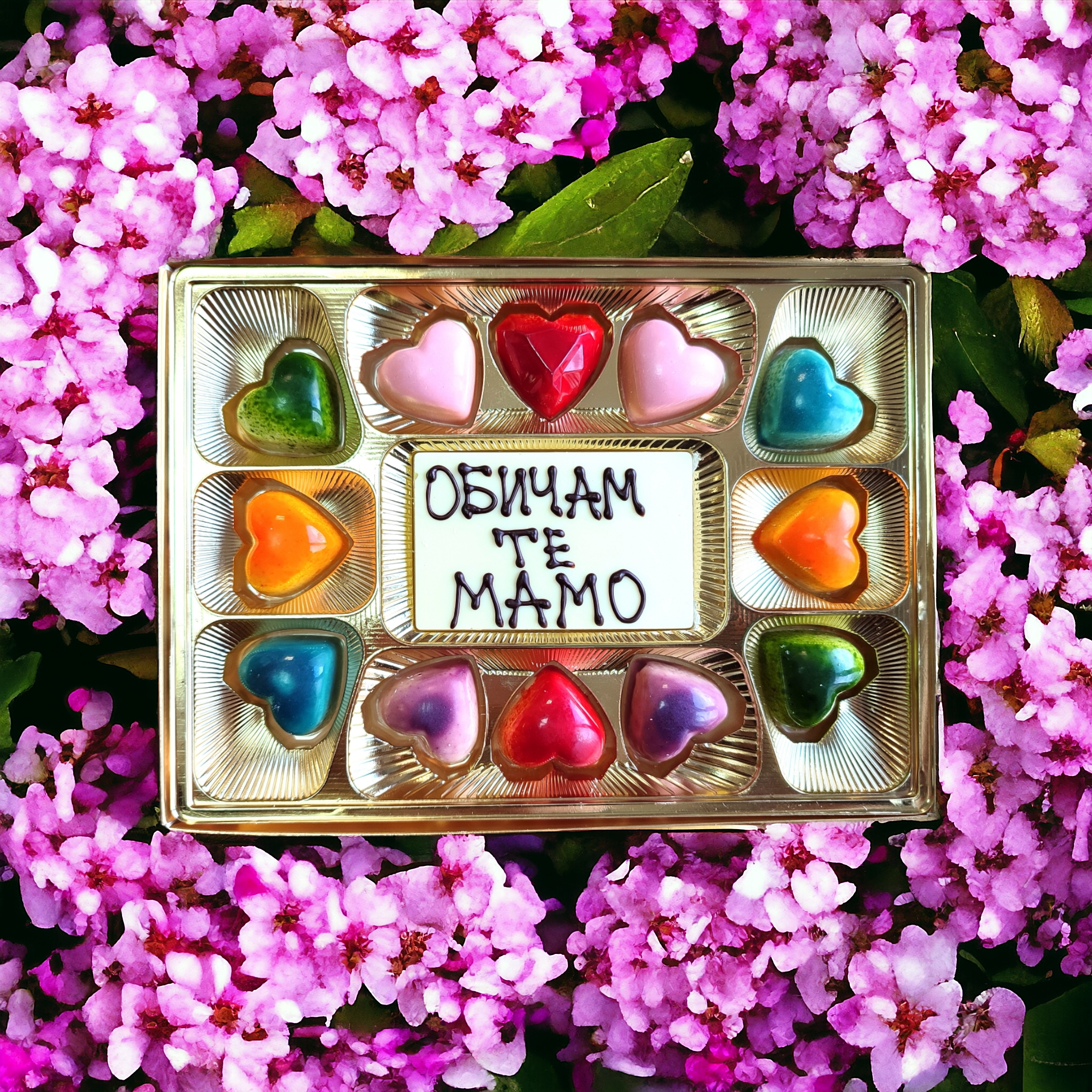 Кутия Обичам те Мамо с бяла плочка с 12 разноцветни сърца