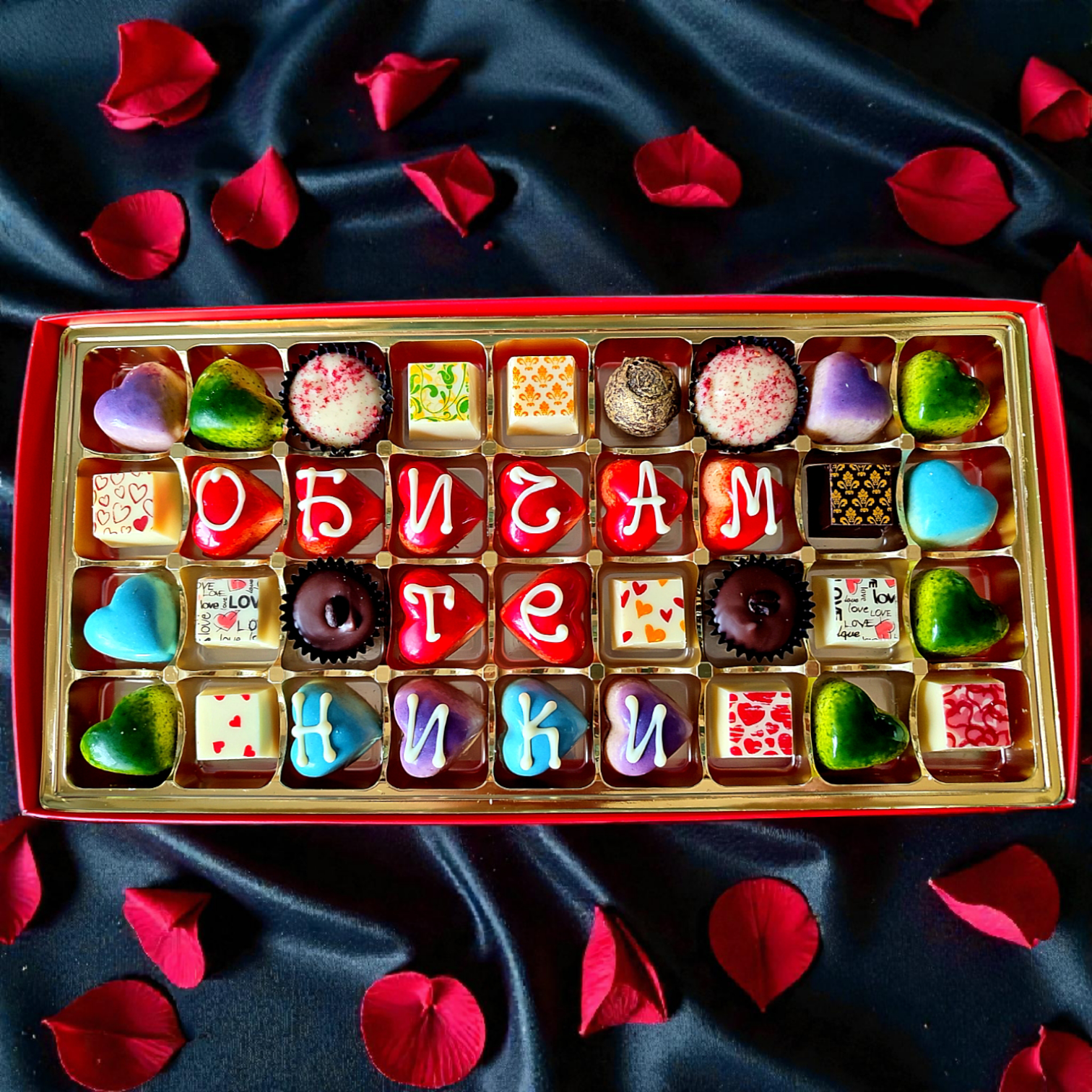 Кутията съдържа 36 ръчно изработени и ръчно декорирани шоколадови бонбона с авторски пълнежи.