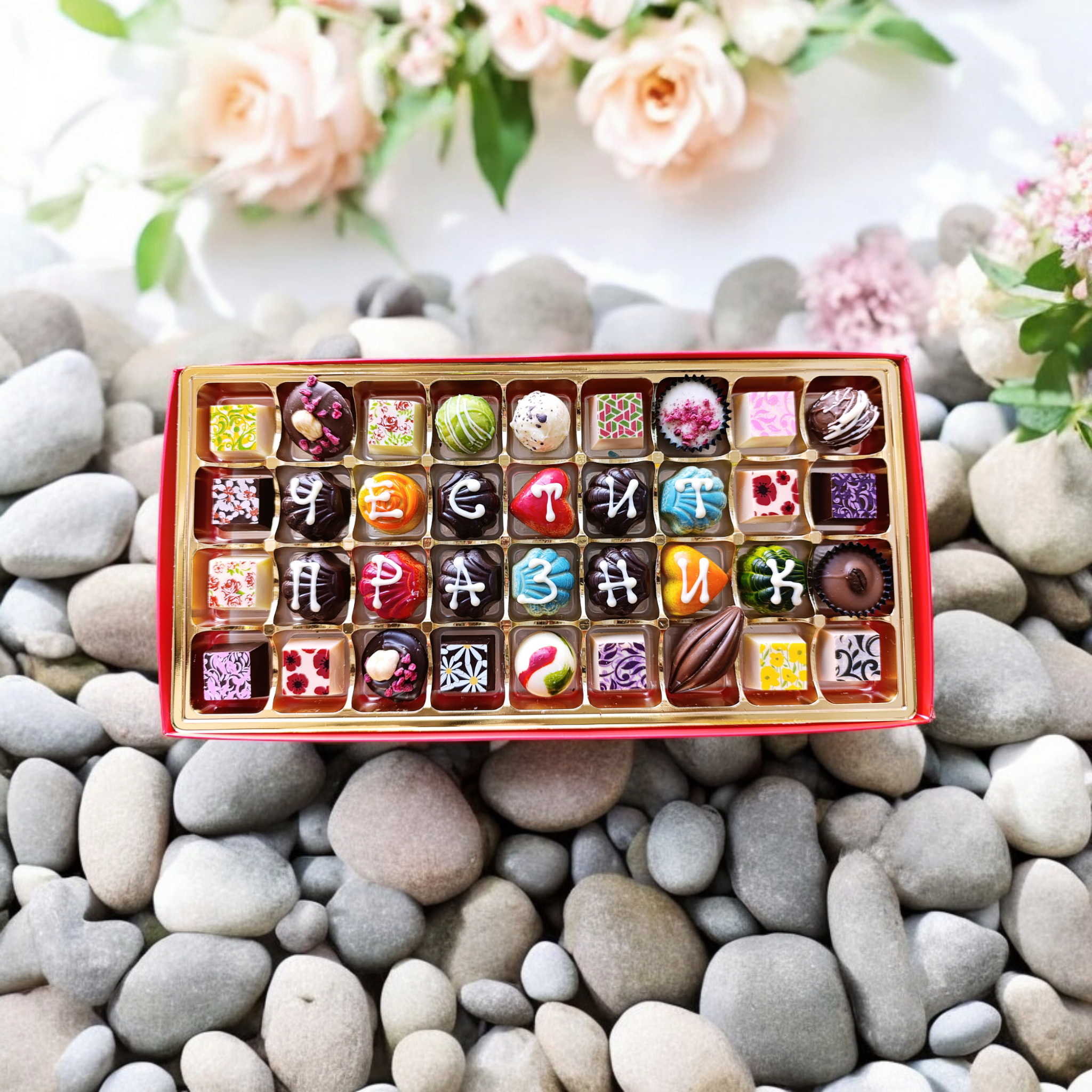 Кутията съдържа 36 ръчно изработени и ръчно декорирани шоколадови бонбона с авторски пълнежи.