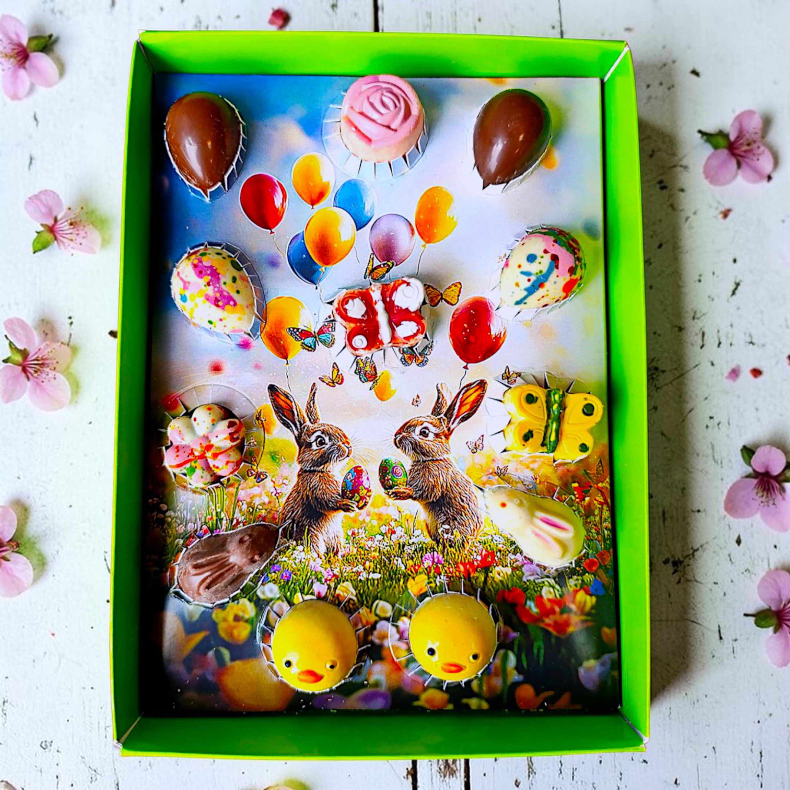С гордост и радост представяме новата ни красота: Великденска кутия-картина с 12 великденски бонбона яйчица, пиленца, цветя, пеперудки и зайчета