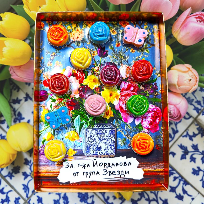 Представяме новата ни красива кутия-картина с 12 бонбона цветя и пеперудки.
