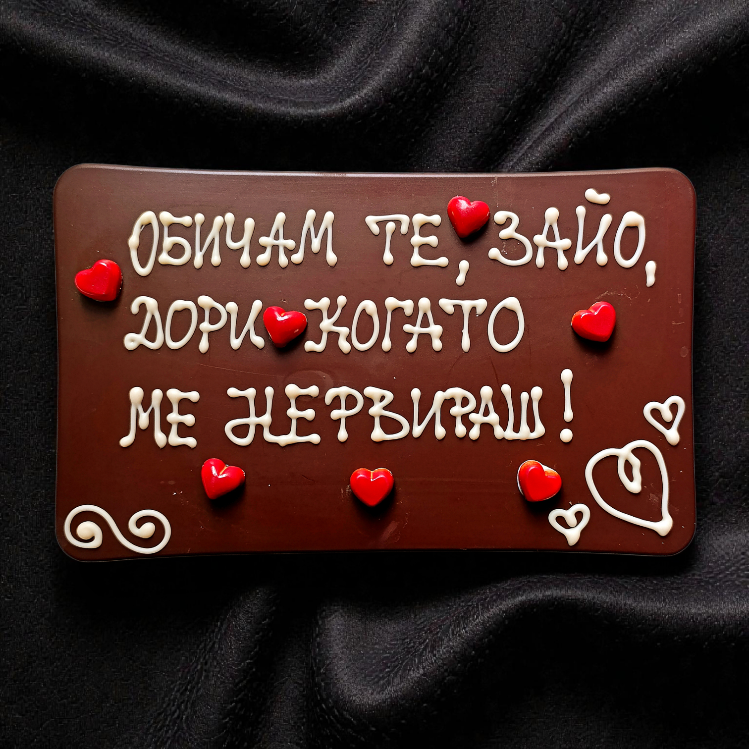 Огромен 500-грамов шоколад за любимия човек с весел надпис. Нека изненадата бъде свързана със смях и усмивки!