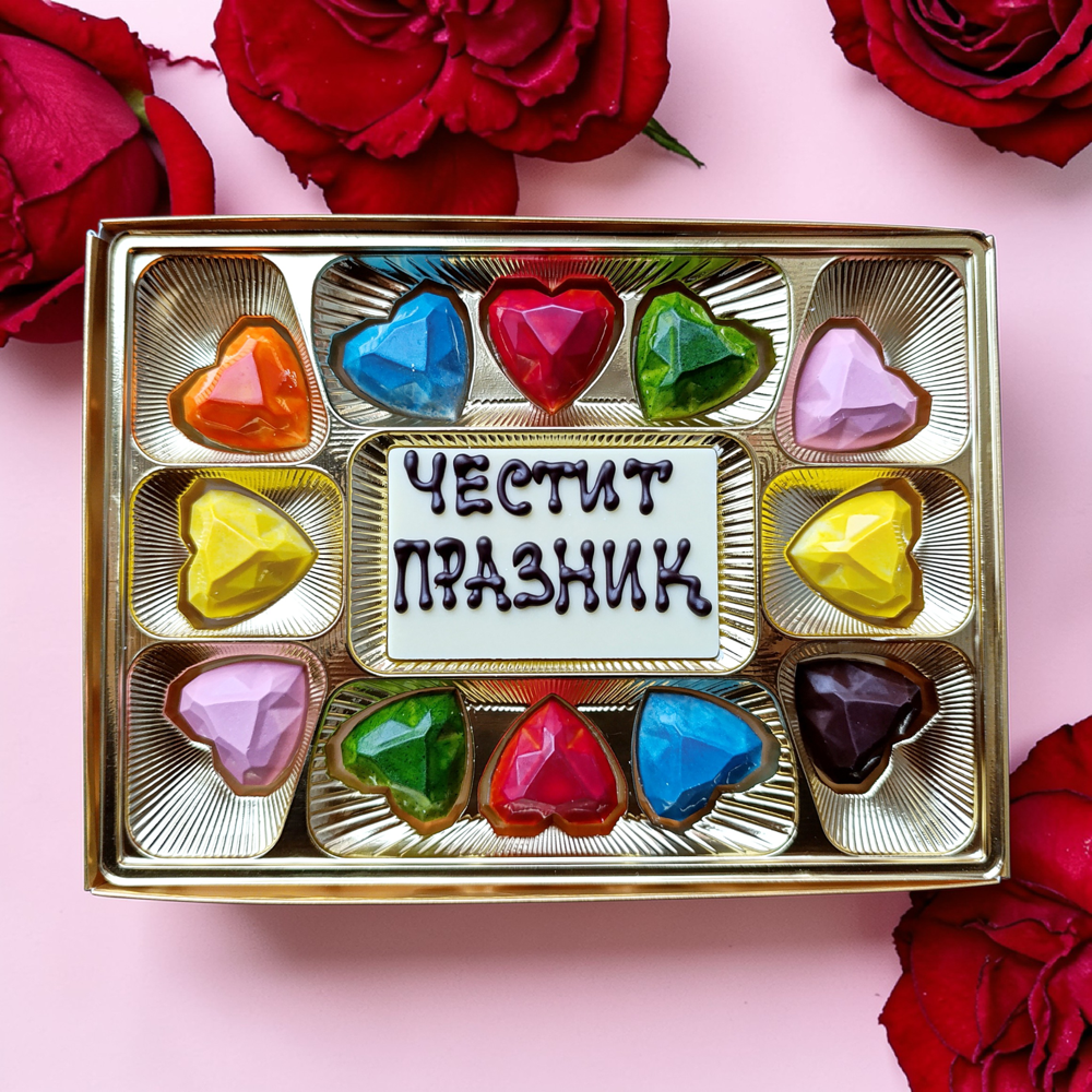 Честит празник - кутия с бяла плочка с надпис и 11 разноцветни сърца и едно сърце от черен шоколад