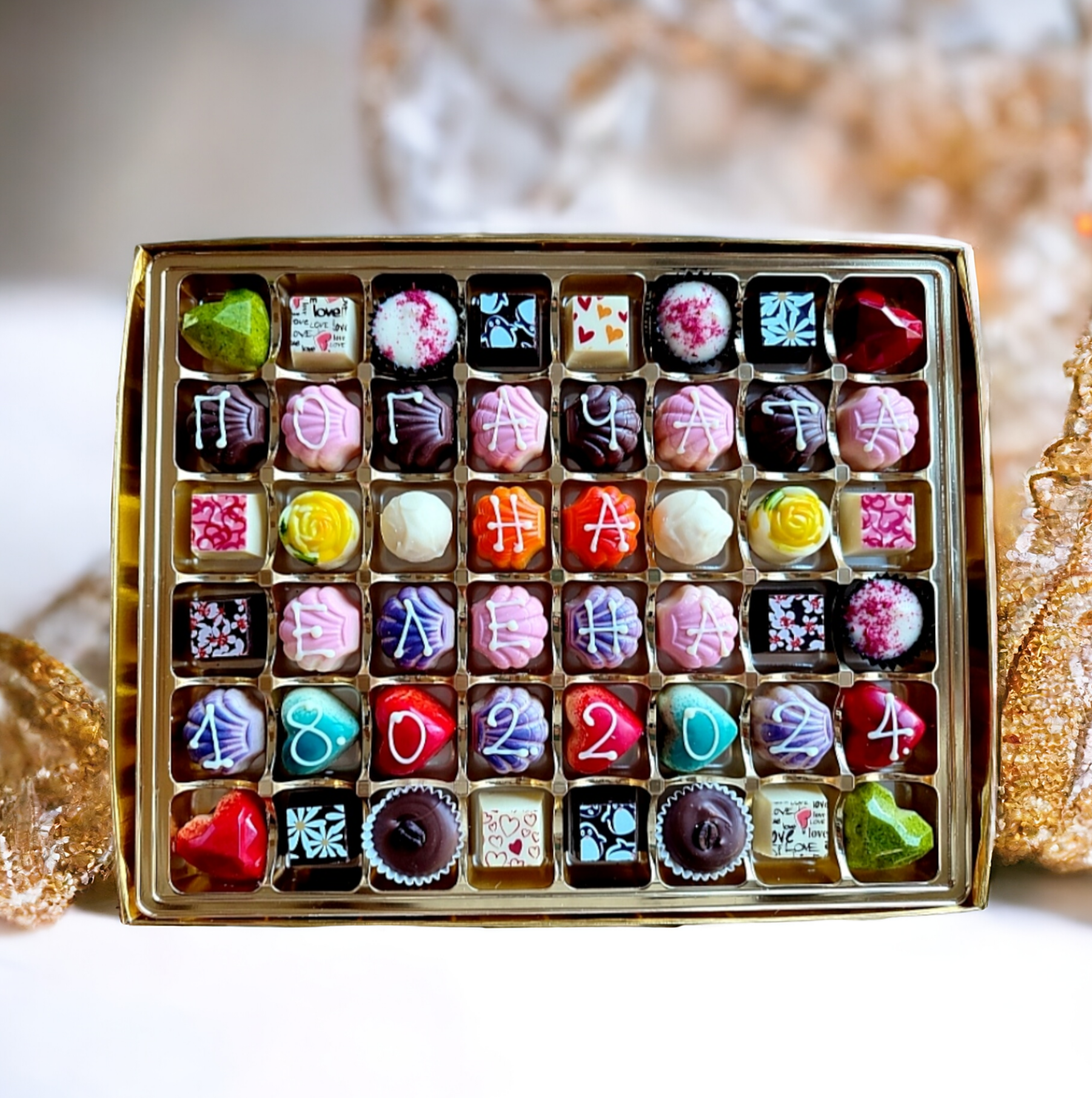 Красива, голяма и луксозна кутия с пожелание, изписано на ръка с шоколад върху ръчни шоколадови бонбони.
