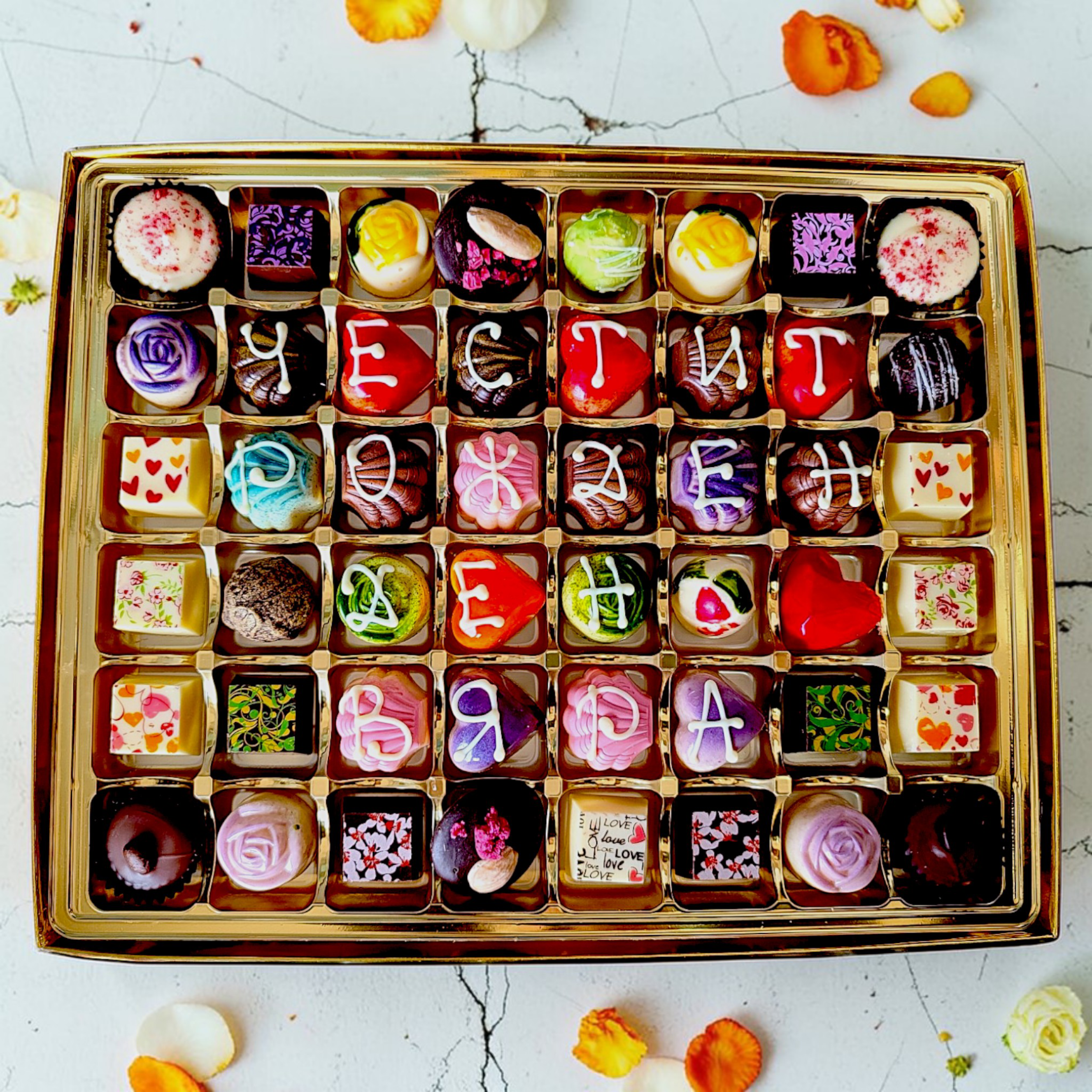 Луксозна елегантна кутия с 48 ръчни шоколадови бонбона с разнообразни пълнежи от нашата колекция.