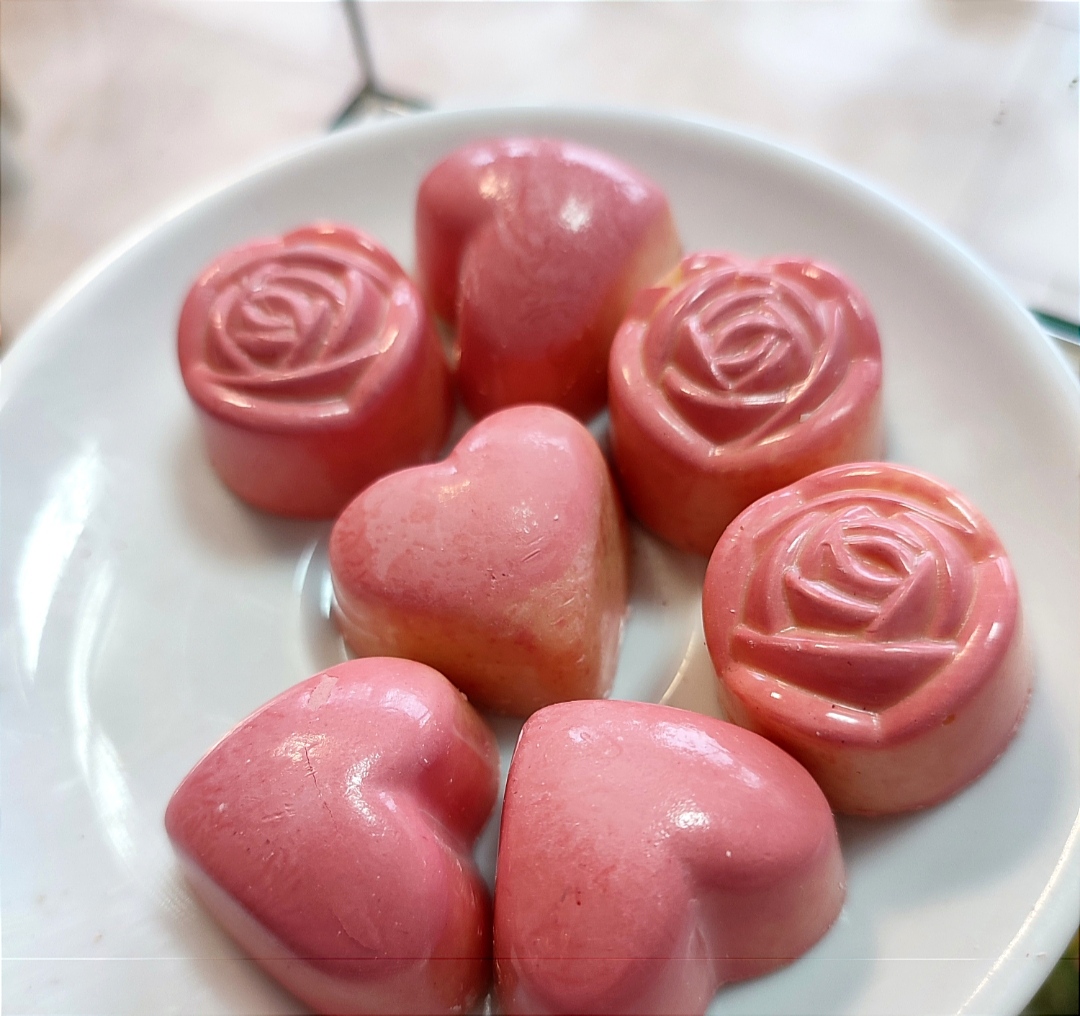 Бял шоколад в комбинация с бледо розово ,  пълнеж от бял шоколад  с лимон, кокос и кубински ром