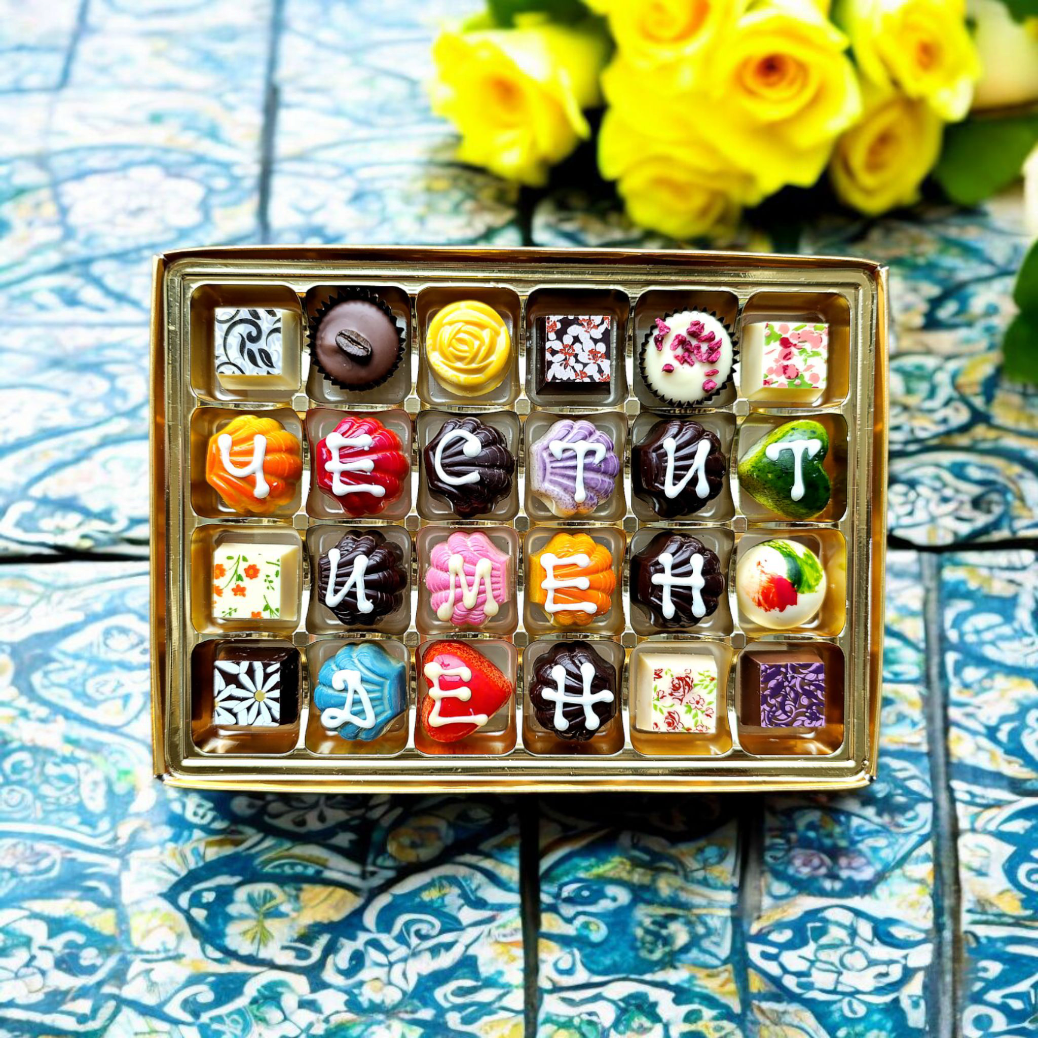 24 Ръчни гурме шоколадови бонбони изцяло с ръчна декорация и надпис.
