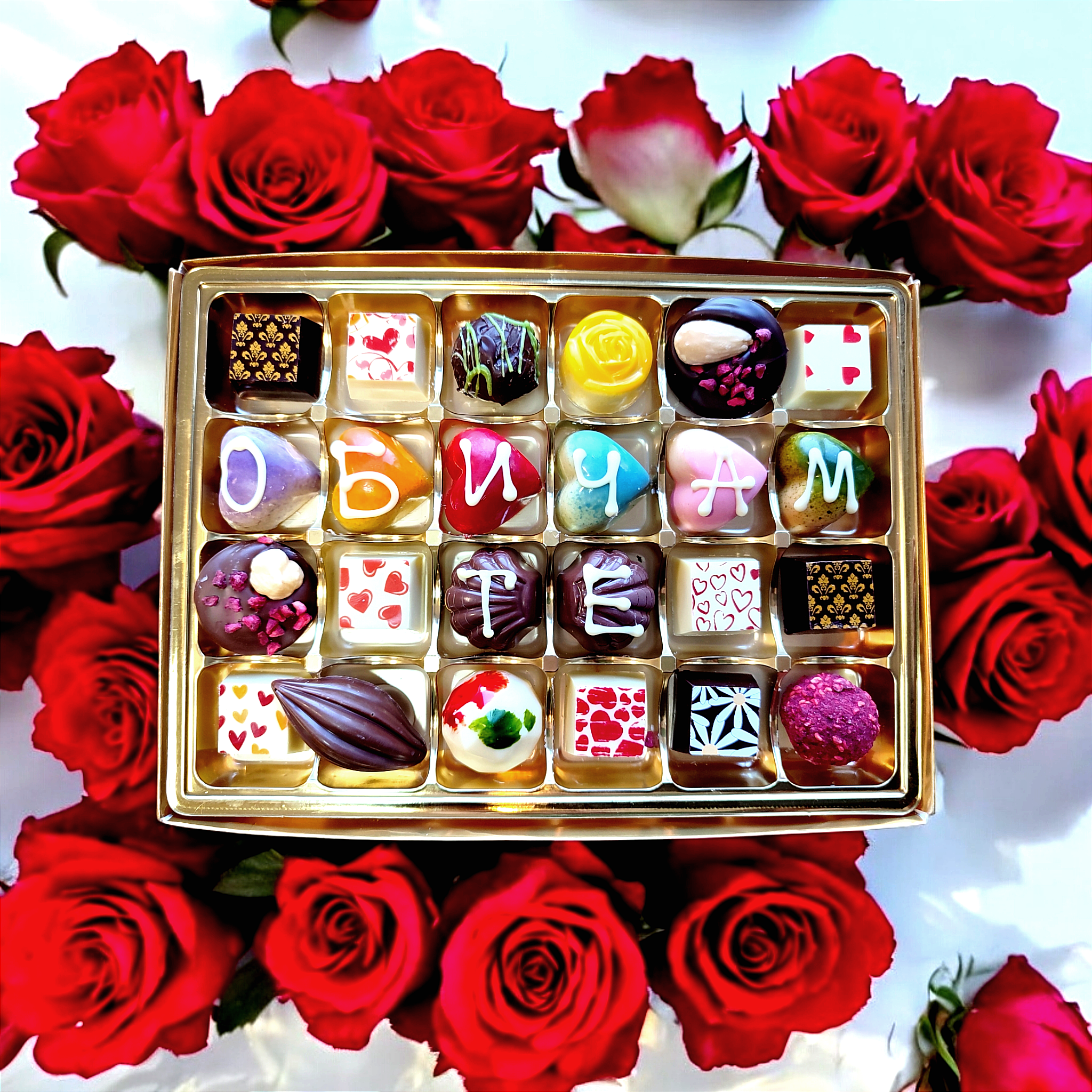 24 ръчно изработени шоколадови бонбони с надпис "Обичам те"